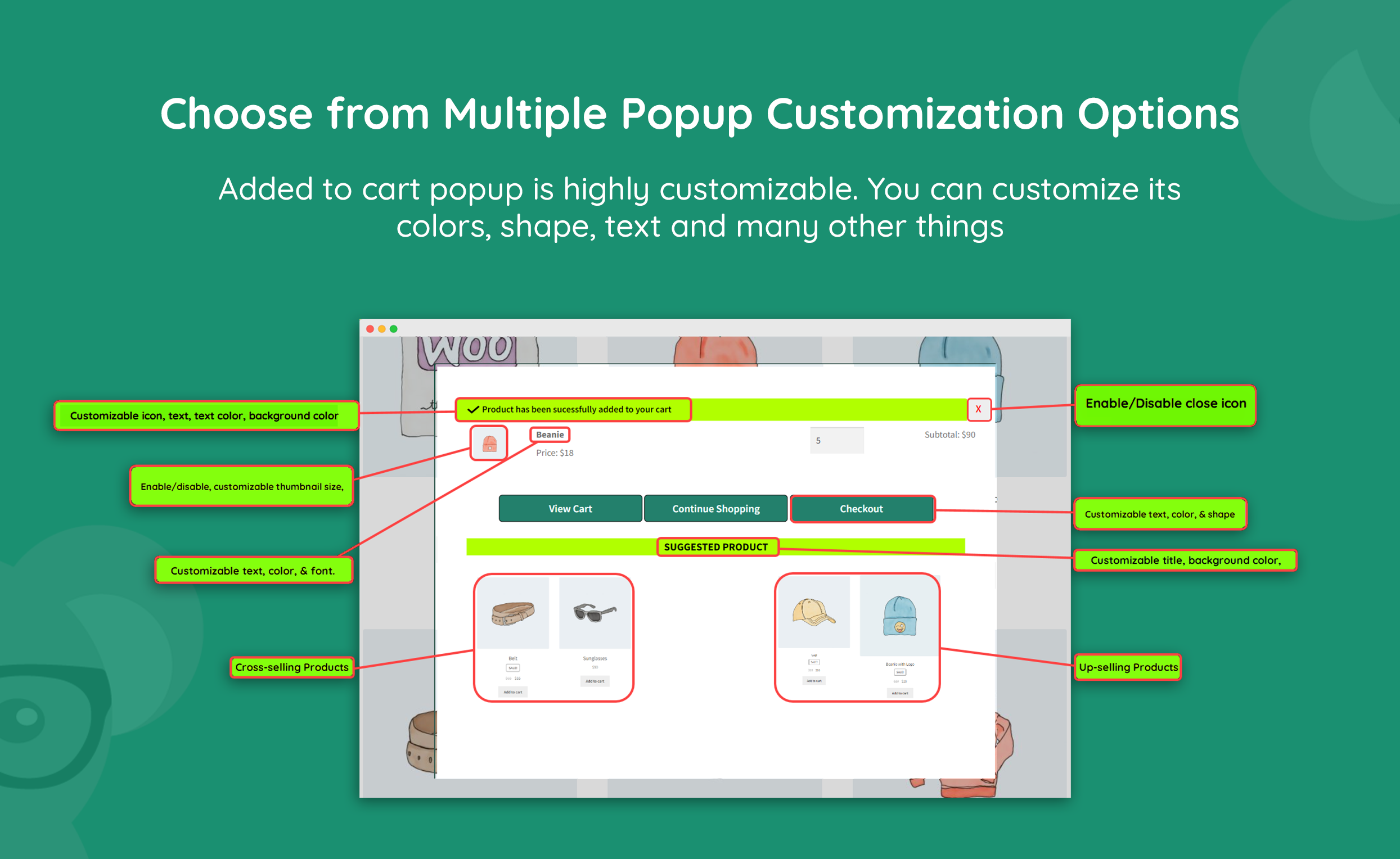 Showcase a custom success message via a popup when an item is added to the cart. Enhance the customer experience & increase the average order value through cross-selling & up-sell items within the same popup.