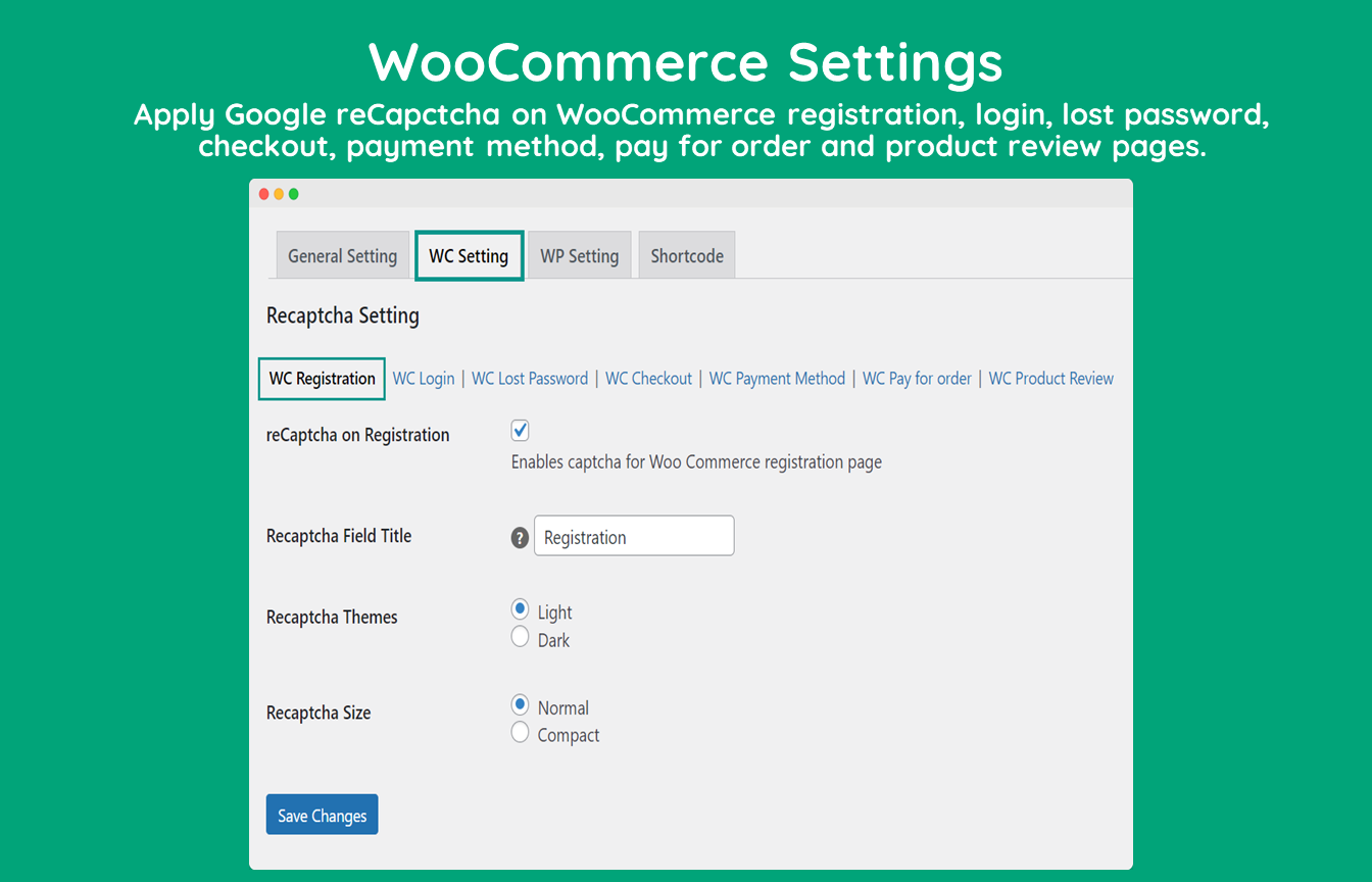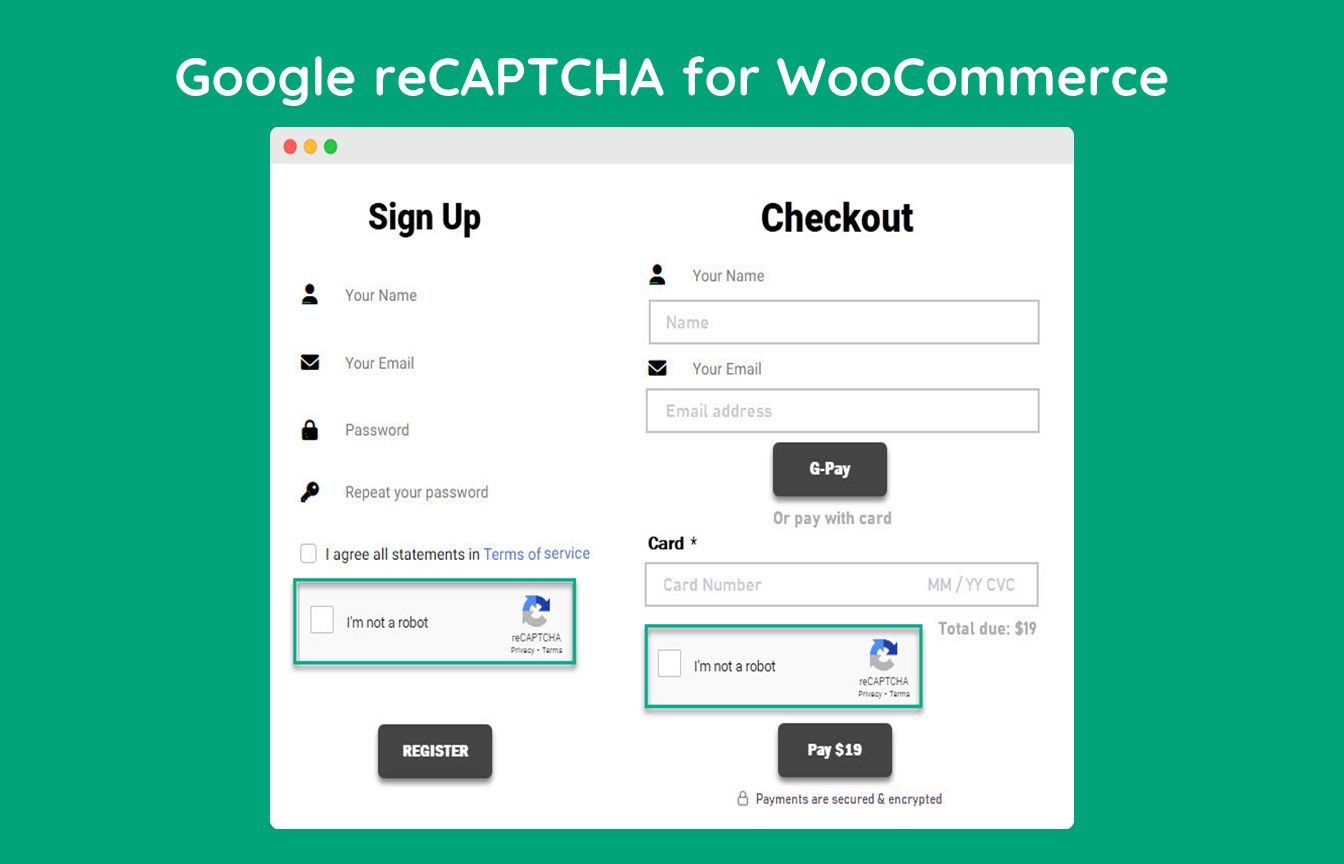 You can add reCaptcha to WooCommerce registration, password, payment, and other pages.