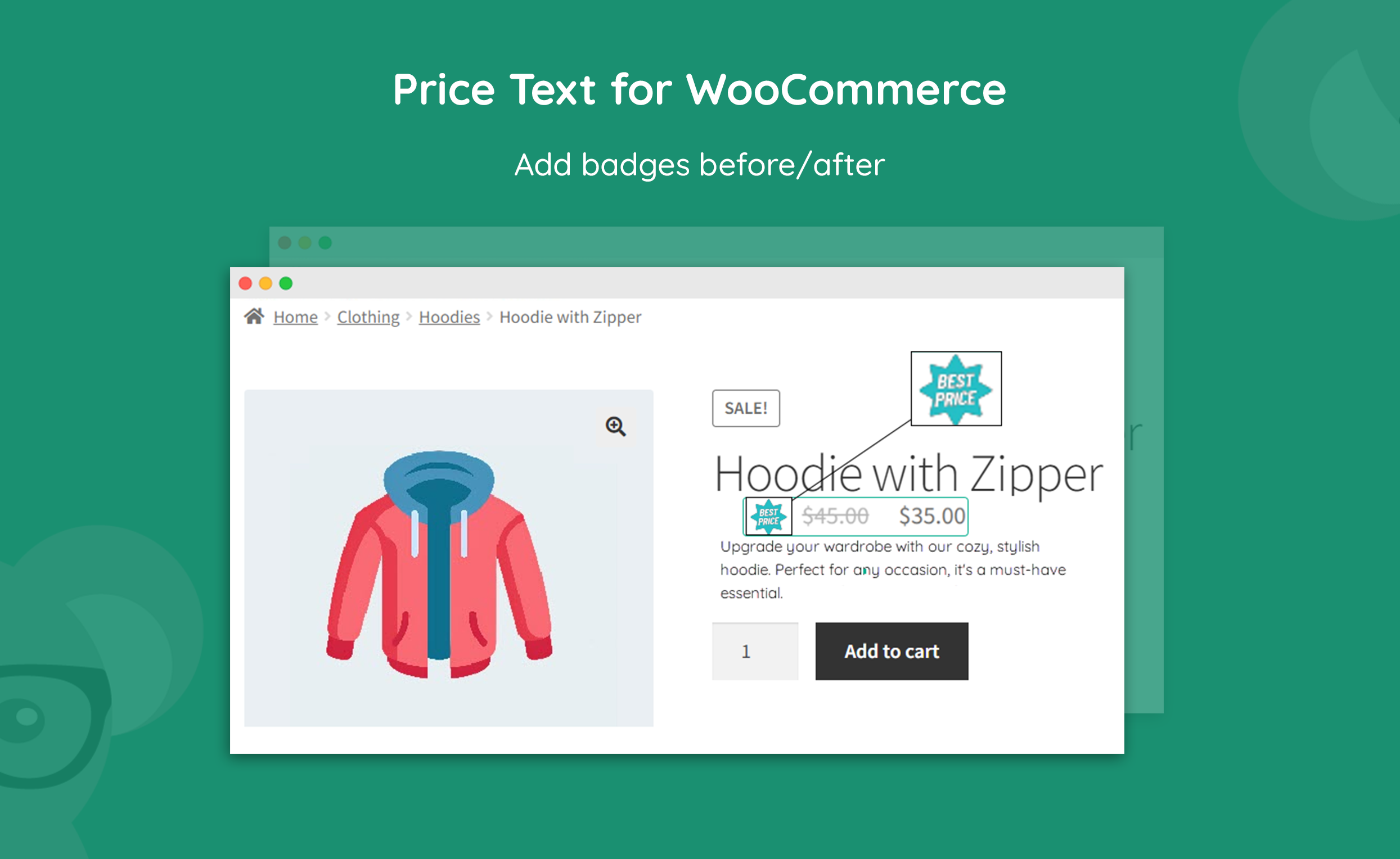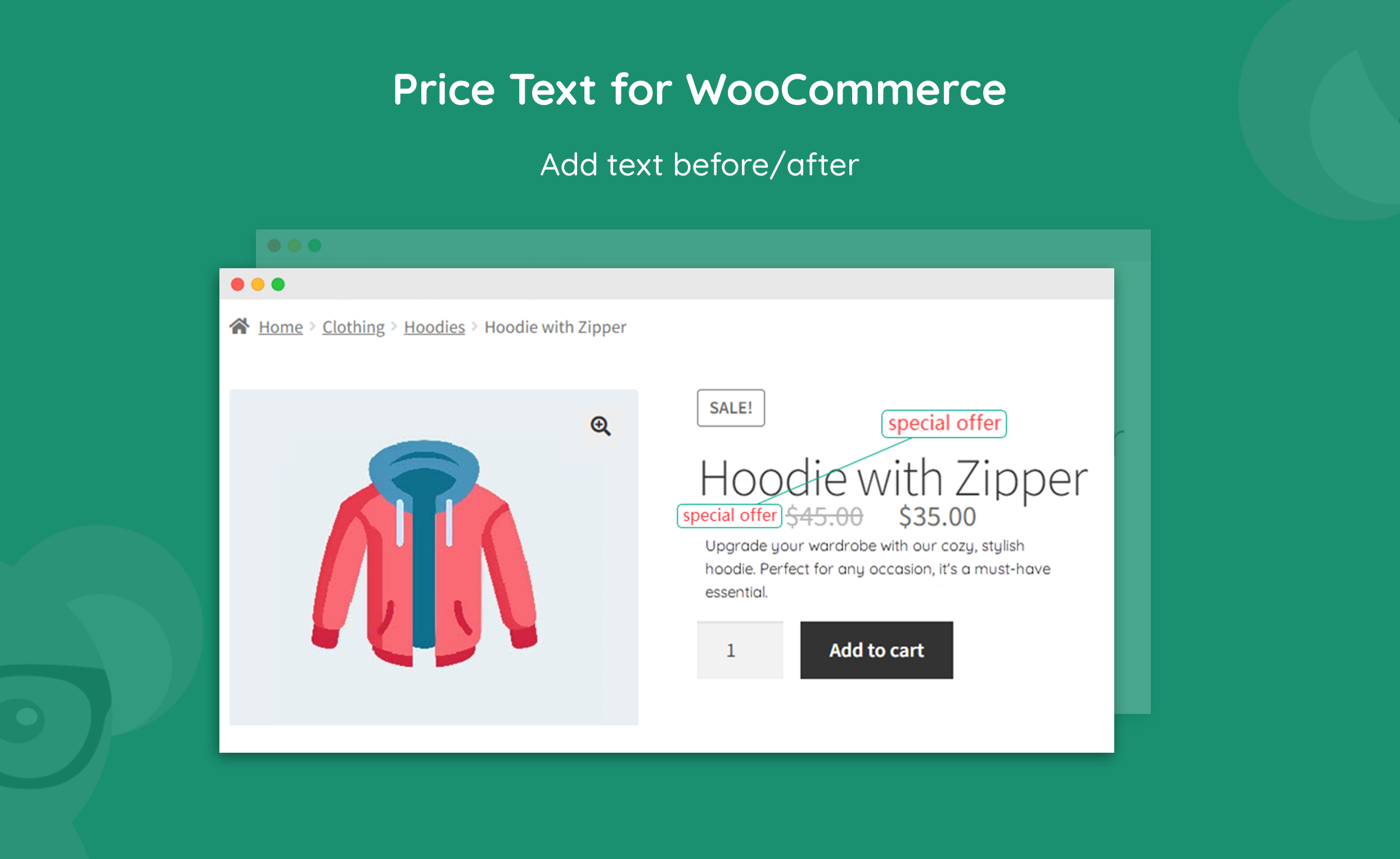 Display custom text before or after product prices to convey additional information, such as sales & discounts, pricing units, limited stock, etc.