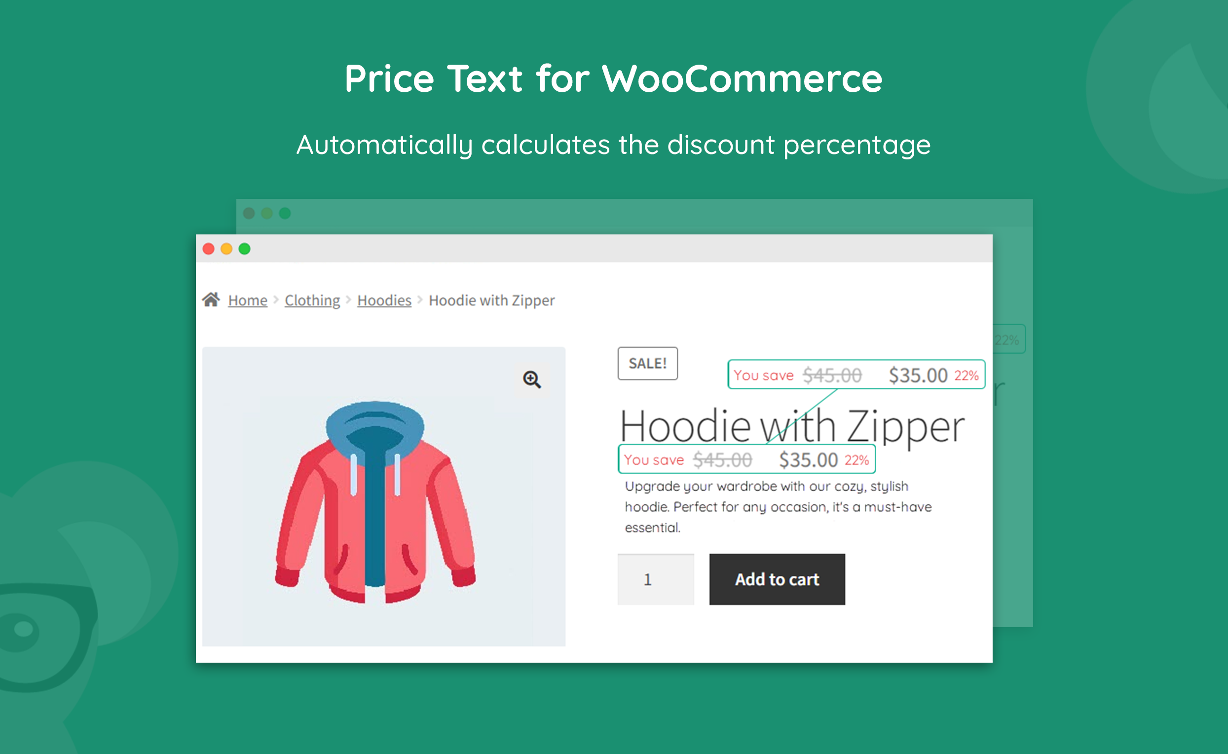 With the WooCommerce Price Text plugin, you can automatically calculate and show the percentage discount for a particular product. Simply choose an item and add regular and sale prices. Once these values are added, add the shortcode: [Discount]. The discount will be calculated automatically & displayed before or after the price.
