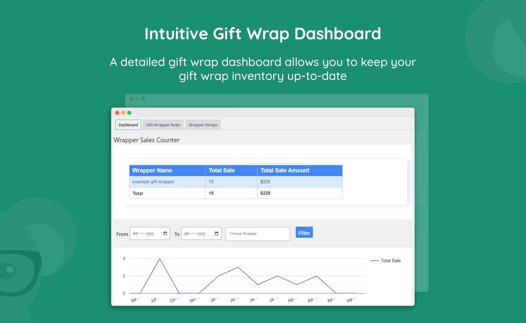 The gift wrap plugin WooCommerce comes with a comprehensive dashboard with a detailed overview of sales generated by each design. The dashboard offers a sales graph that showcases the performance of individual gift wrap designs. Users can filter the sales graph by date range and select a specific gift-wrapping design to analyze its performance within the chosen period.
