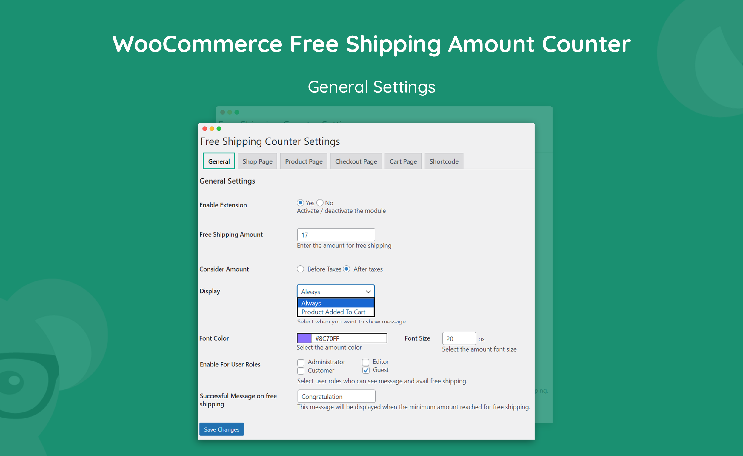 Display the amount counter in multiple locations, including the shop, product, cart, and checkout pages. Adjust the free shipping amount, and once a customer qualifies for free shipping, display a custom message. You can also show custom text before and after the amount for each page separately.