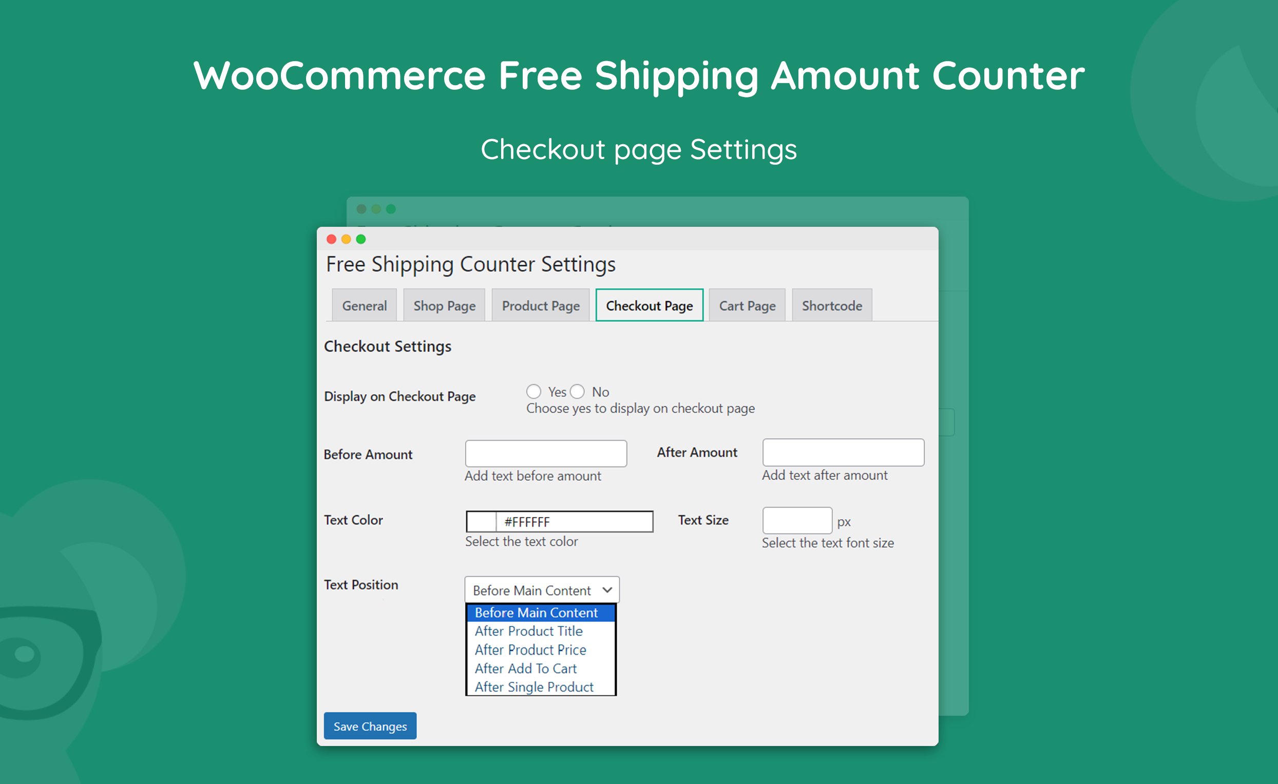 Place the Free Shipping Counter on the Checkout pages. Choose the text position: After the Product title, after the Product Price, after the Add-to-cart, after a Single Product, or before the Main Content.